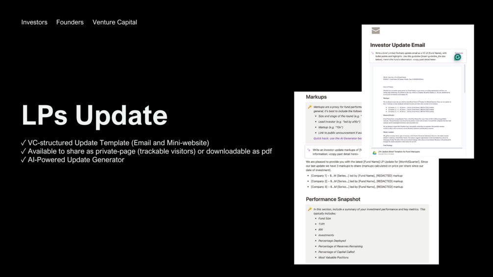 Shareable Investor Updates: Publish updates as a mini-website or download them as a PDF to share with LPs and partners.